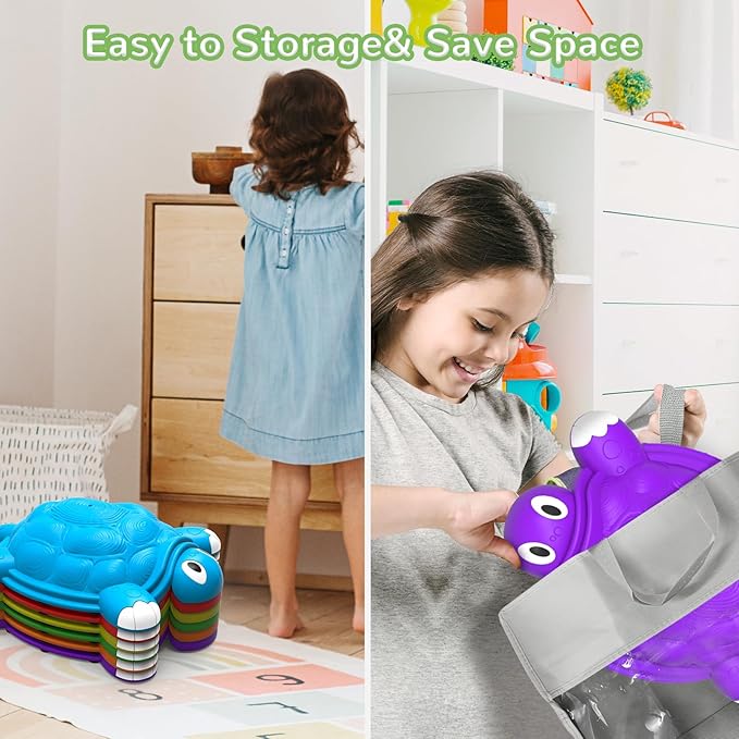 - Value Stepping Stones for Toddlers: There are 6 pcs of turtle jumping step stones which are in 6 different colors, a turn plate and 30 cards in the package. Also the climbing toys comes with a sturdy bag for easy storage and carrying. Boys and Girls can establish the good habit of storing toys after playing. The coordination play toy is easy to clean. What's more, the sensory play equipment can be used as the birthday gifts, children's holiday gifts for ages 3, 4, 5, 6, 7, 8 year old kids.