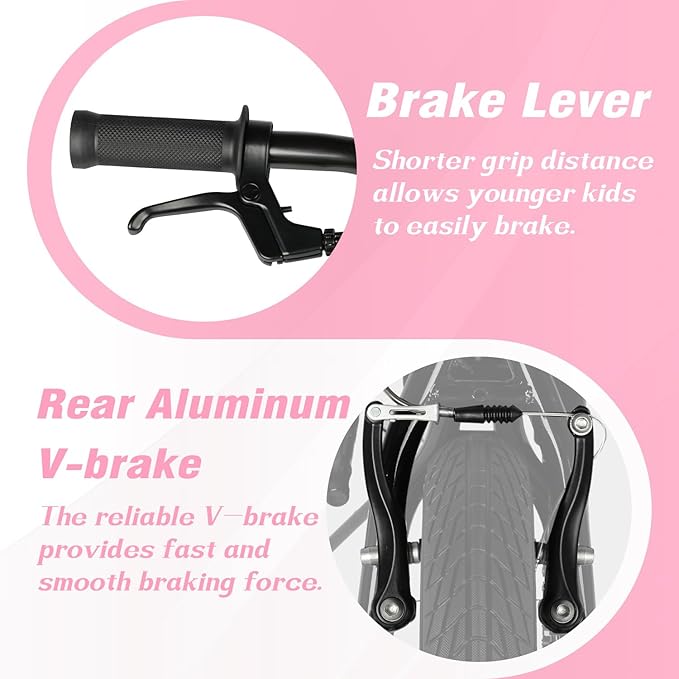 - 【Child-Safe Braking System】 Features an easy-to-use coaster brake and rear v-brake perfect for small hands, a half chain guard for safety, and wide tires for slip-resistant traction.