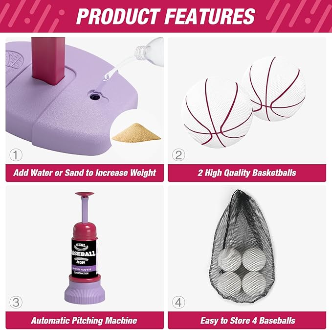 - 3 WAYS TO PLAY - ①Kids basketball hoop: with 2 basketballs for multi-player games. ②Kids baseball tee stand: with stretchable bat and 4 baseballs. ③Automatic pitching machine: hitting an automatically ejected baseball. 2 in 1 kids basketball hoop and tball sets provide you and your family or friends to enjoy a fun sport game and have more fun