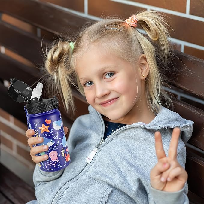 GOPPUS Kids Water Bottle (Straw Lid) - 14 Oz Stainless Steel Travel Bottle, Double Wall Vacuum Leak Proof Kids Cup for School Boys Girls,Under the Sea