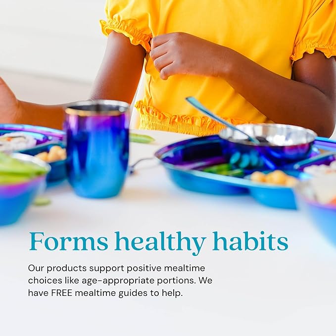 - COMPLETE TODDLER PLATES & BOWLS SET: The 5-piece Mindful Mealtime Set includes everything kids need for mealtime — a divided plate, small stainless steel bowl, stainless steel training cup, and kids fork and spoon set. Featuring smart portions, balanced weight, and easy-to-hold sizing, these toddler dishes are ideal for ages 1 to 5. Our reusable non plastic kids plates and bowls sets support self-feeding and build confidence as they grow.