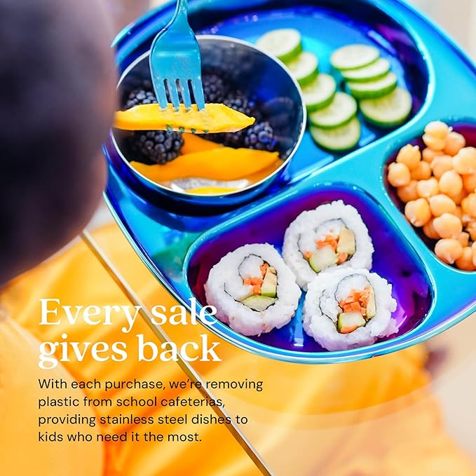 - BUILT TO LAST FOR GENERATIONS: Designed for everyday use and backed by Ahimsa’s lifetime warranty, this kids stainless steel dinnerware set is a sustainable investment in your child’s health and future. These metal kids dishes are durable, stackable, and easy to clean — heirloom-quality kids stainless steel plates and bowls made to be passed down, not thrown away.