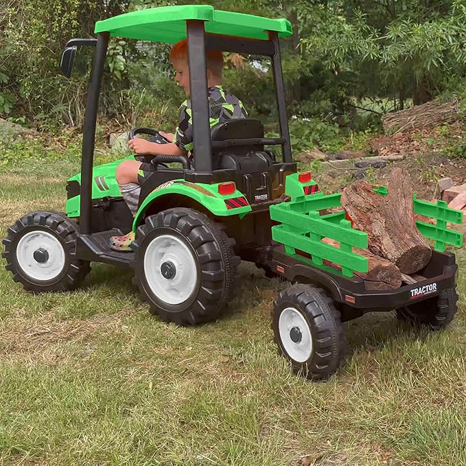 - 【ldeal Kids' Electric Vehicles Gift】: With a realistic appearance, bright lights, an easy-tocontrol gear shift handle and a steering wheel with a horn, this toddler tractor is dedicated to providing your children with the most authentic drivingexperience. Children are always playing the role of adults. This lawn tractor with trailer is perfect for children to play outdoors, giving your kids a thrilling driving experience.