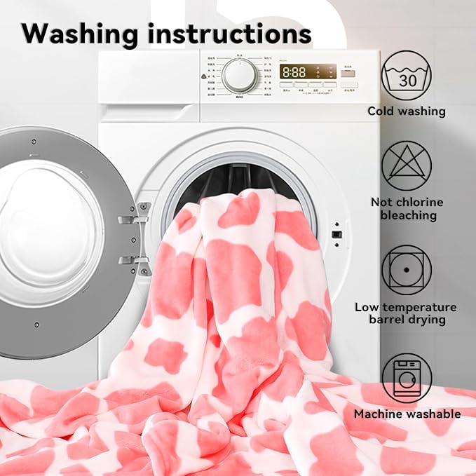 - COW PRINT BLANKET- The cow pink blanket is vacuum packed, please wash the cow print couch throws once to air dry for a period of time when you receive the cow themed throw blanket, the cow print fleece throw will become fuzzy. The cow print blankets and throws are machine washable in cold water, on a gentle or delicate cycle. The cow print soft blanket does not bleach. Cow print blanket throw is easy to store and high color fastness, and is effortless to care for