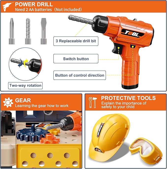 - 【Multifunctional Tool Bench for Kids】The toddler workbench come with various of tools like power drill, hammer, screwdriver, hand saw, goggles, kid hard hat, tape measure, wrench and more. Everything is functional and realistic.