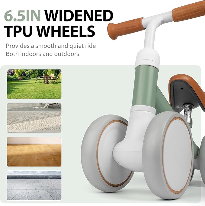 - SMOOTH AND QUIET RIDE: Equipped with silent wheels, our baby balance bike provides a smooth and quiet ride, both indoors and outdoors (avoid uneven road surfaces). The non-slip tires offer great traction, enhancing stability as they cruise around