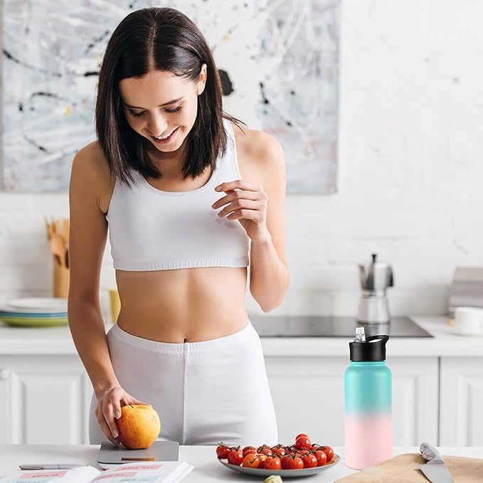 VEGOND 32 oz Insulated Water Bottle Stainless Steel Metal Water Bottles with Leak Proof Straw Lid & Spout Lid, Wide Mouth Double Walled Vacuum Travel Sports Bottle, Green Pink