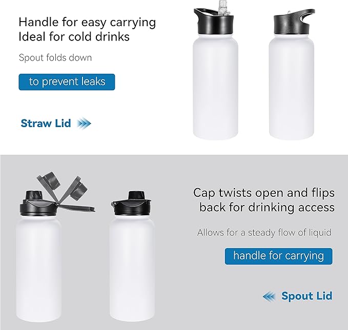 - 2 LEAK PROOF LIDS: Each insulated water bottle equipped with 2 leak proof wide mouth lids: 1 flip up straw lid and 1 easy twist spout lid to meet your needs for different occasions. Leak proof and have handle for easy carrying