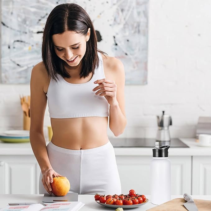 VEGOND 32 oz Insulated Water Bottle Stainless Steel Metal Water Bottles with Leak Proof Straw Lid & Spout Lid, Wide Mouth Double Walled Vacuum Travel Sports Bottle, White