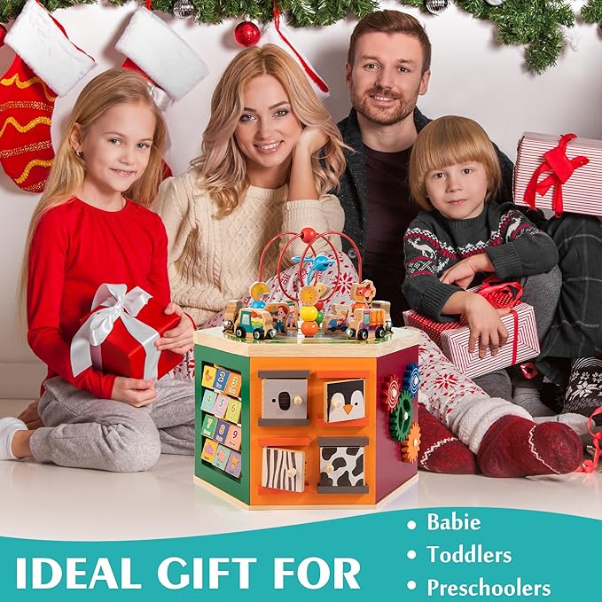 - 【MULTIPLE GAMES, HOURS OF FUN】This wooden activity cube offers 9 engaging games in one - shape match, abacus, zigzag paths, flip and learn farmyard, peek-a-boo farm animals, spin the gears, bead maze, work on the farm, magnetic trains drive along the track. Keep your little one entertained for hours with this versatile playtime companion.