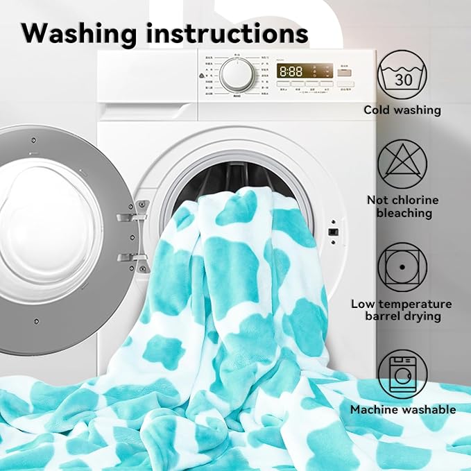 - Cow Blanket for Bed & Couch - The baby blue blanket is vacuum packed, please wash the blankets & throws once to air dry for a period of time when you receive the azure throw blanket, the boho throw blanket will become fuzzy. The cobalt plush blanket are machine washable in cold water, on a gentle or delicate cycle. The bed throws do not bleach. Warm blanket throw is easy to store and high color fastness, very easy to care for.
