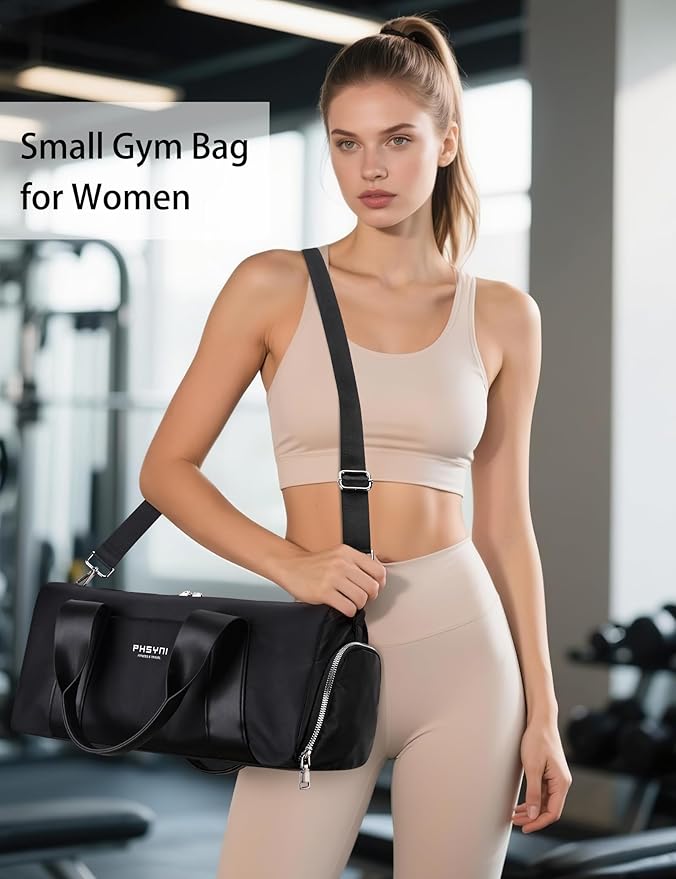 - 【Cute Small Gym Bag,Pu Wrist Strap】- Versatile Women Workout Bag,Arried as a Shoulder Bag Or Handheld Purse,1. Trim - Comfortable Vegan Leather Carry Handles, Classic Texture Exudes Sophistication. 2. Durability Nylon Fabric, Reinforced Stitching on Stress Points to Ensure Long-Term Use. 3. Foam-Lined Bottom and Side Panels ( 3 Layer Material) Keeps The Structure of The Bag. 4. Adjustable Shoulder Strap, Ideal as Your Short Trip Essential, or Daily Commute Partner