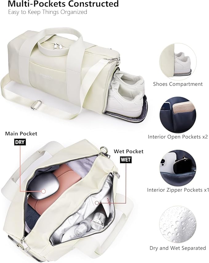 Compact Sports Gym Bag for Women, Cute Mini Duffle Bag with Wet Pocket & Shoes Compartment, Personal Item Travel Workout Bag, 16"-Small, Beige