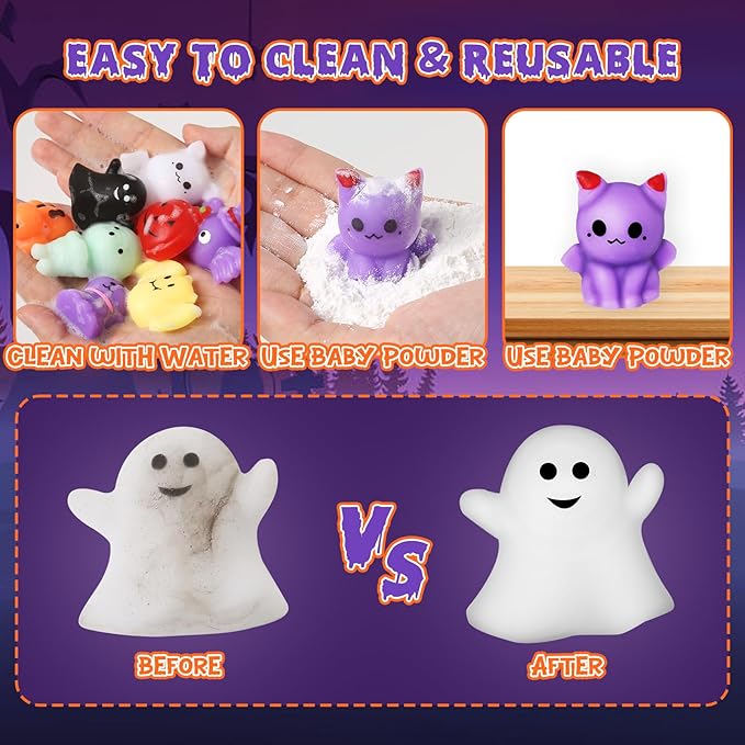 - SAFE FOR CHILD:Halloween squishy set made by environmental friendly material, individually wrapped,washable, easy clean,safe and non-toxic,meet US Toy Standard,protect children's health. This perfect gift bulk for your kids on halloween party, make them have a deep impression of halloween Day.