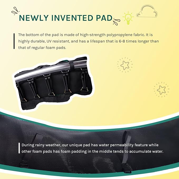 - [ Newly Designed Pad, HIGH-STRENGTH POLYPROPYLENE! ]: Highly durable, UV resistant, water-permeable and has a lifespan that is 6-8 times longer than that of regular foam pads. The pad is sewn with high-quality straps at the bottom, tightly wrapping around the frame to prevent loosening.