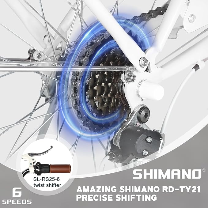 - 【High Performance】The beach cruiser bike features a Shimano 6-speed gear system and a high-carbon steel frame, helping you conquer steep hills with ease. Suitable for a variety of scenarios, from leisurely rides to long-distance commuting.