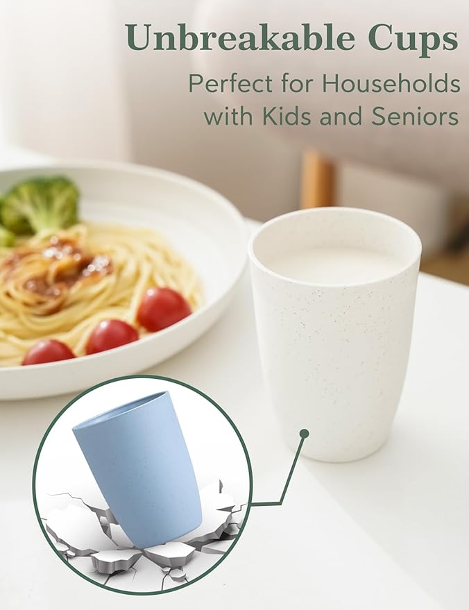 12 OZ Wheat Straw Cups Reusable Drinking Tumblers, Unbreakable Cups for Kitchen - BPA Free, Dishwasher Safe, Set of 8, Ombre Blue