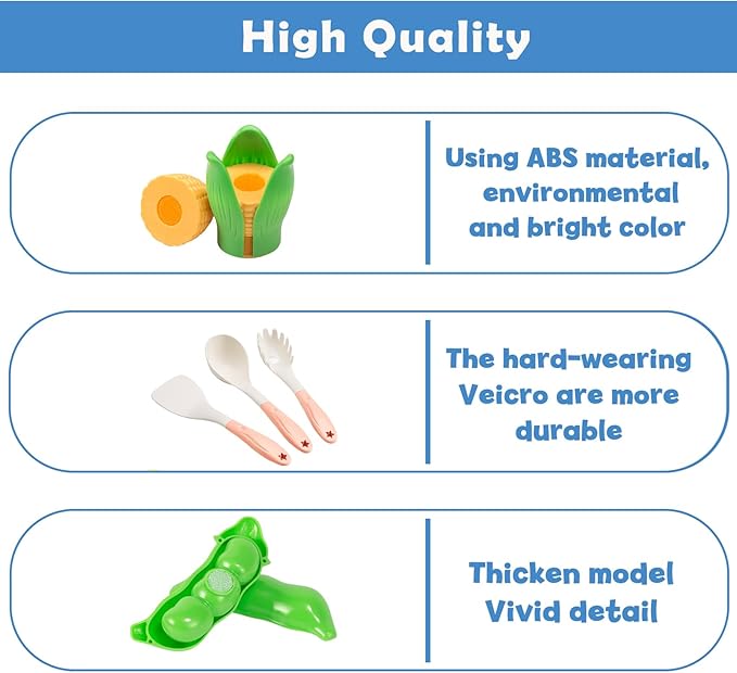 - Make Learning Endless Fun - Our pretend cooking playset encourages 3+ years old children to use their imagination and creativity while teaching them about different kitchenware, colors, fruits and foods and helping promote their color recognition, eye-hand coordination, intelligent learning and learn more about cooking. Perfect for cooking chef pretend play, baby role play