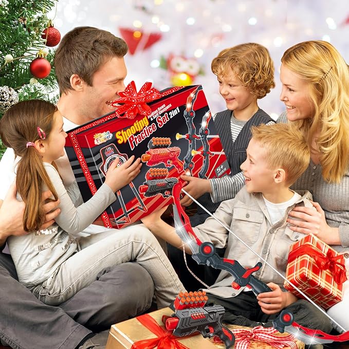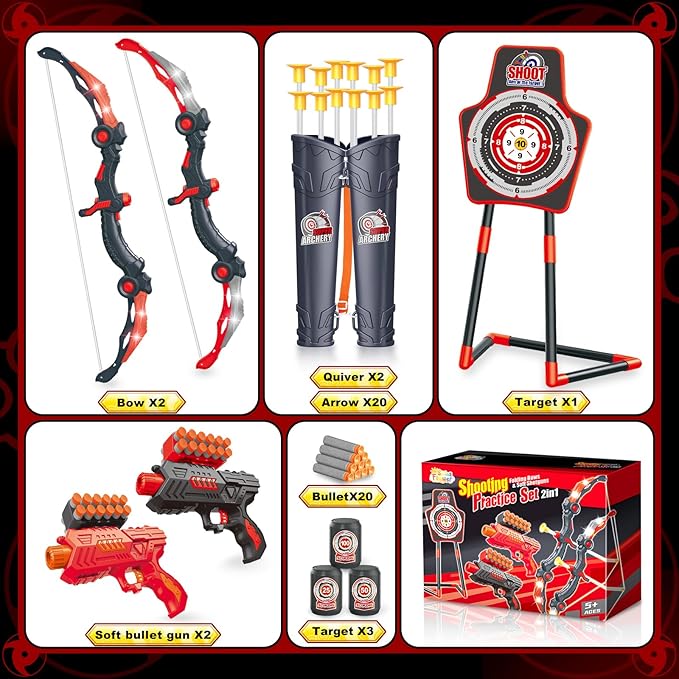 - 2 In 1 Shooting Games:SpringFlower upgraded shooting toy set is compatible with 2 shooting modes, bringing more fun for children's play. It includes 2 collapsible bow with LED lights, 20 suction cup arrows, 2 adjustable shoulder strap quiver, 2 foam darts shooting toy guns, 20 foam darts (10 blue and 10 green) and 1 standing shooting practice target. An adequate amount of archery equipment will provide players with a great value for the game experience.