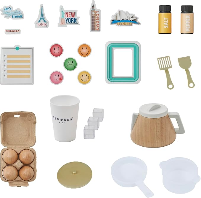 - (17) KITCHEN ACCESSORIES: a coffee pot, spatulas, pot & pan with lid, two seasoning bottles, a cup, three pretend ice cubes, 4 "crackable" eggs, two recycling bins and magnetic items for the refrigerator door