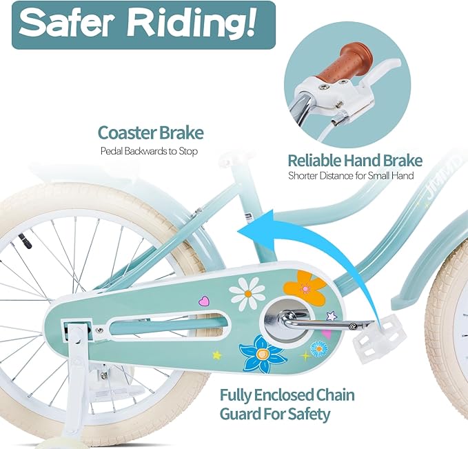 - 【Safer Riding】This girls bike is designed with your kids' safety in mind. The fully enclosed chain guard prevent kids' feet from being pinched, and ensures that free from any potential entanglements. With both a coaster brake and a reliable hand brake of our kids bike, your kids can confidently maneuver and stop the bike with ease