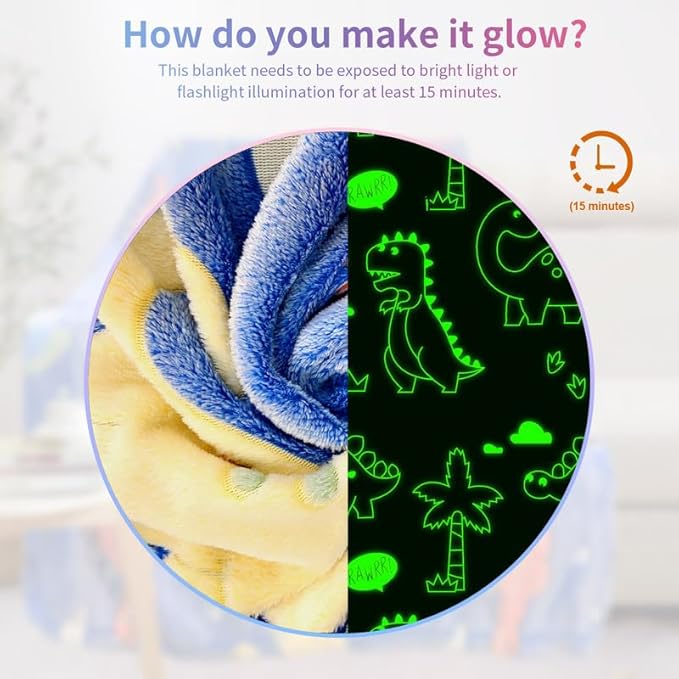 - Glow in the Dark Blanket: This blanket needs to be exposed to sunlight or bright light for more than 15 minutes to glow better. The brighter the light, the more the blanket will glow in the dark. This blanket is a dinosaur toy gift for 3 4 5 6 7 8 9 10 11 12 years olds.
