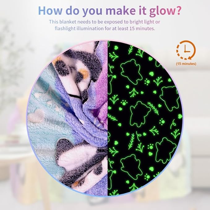 - Glow in the Dark Blanket: This blanket needs to be exposed to sunlight or bright light for more than 15 minutes to glow better. The brighter the light, the more the blanket will glow in the dark. This blanket is a panda toy gift for 3 4 5 6 7 8 9 10 11 12 years olds.