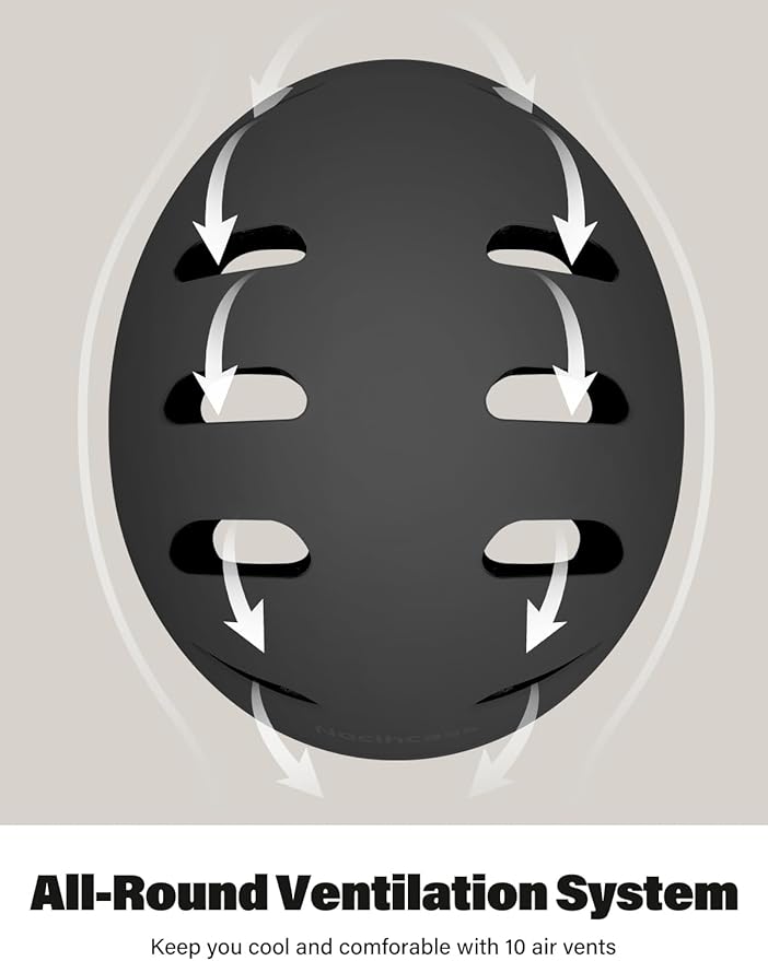 - ADJUSTABLE & VENTILATION-The chin strap and scalloped buckle can be tightened or loosened to adjust size, with the rotating back dial system help you fit snugger. Skate helmet with 10 vents to reduce resistance and breathable, always keep cool and comfortable every ride.