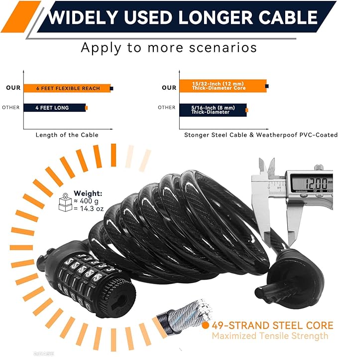 - 5-Digit Combination 6 Ft Longer Cable Bike Lock: More digits in the password mean more security, and you don't have to worry about losing keys. It also comes with a fixed bracket for convenient carrying on the bike