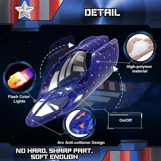 - Safe & Fun for Play - Flying airplane is made of molded foam, safe, bendable, and will not harm kid's hands or feet, and comes with colorful LED lights, kids can enjoy the fun of flying toys even at night. Strong warranty, plz contact seller directly first for any problem you suffered, we will solve it perfectly for you.
