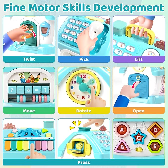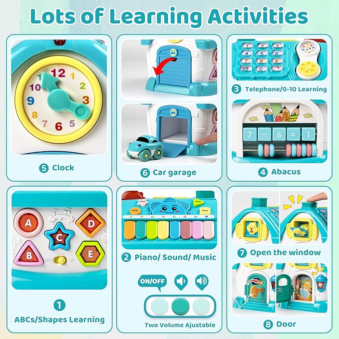 - 【8-in-1 Multifunctional House Toy】: This multi-functional house toy is designed for 1 2 3 year olds. Each side is a new toy: Telephone, Music zone with 8 keyboard; Adjusted clock; Funny animal window; Drive the car out; Mathematics pattern; Shape& letters pattern; Unlocking design; A great toddler boy girl toys! Musical toys for toddlers 1-3.