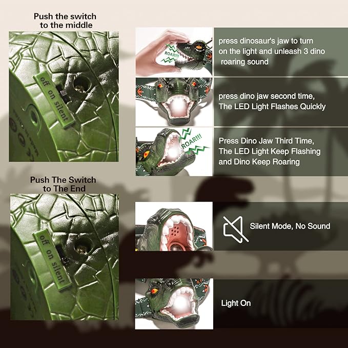 - [Tyrannosaurus Shapes & Roar with 4 Modes] The dinosaur Led headlamp is based on the shape of kids’favorite Tyrannosaurus with 4 modes and simulation roaring sound for kids' outdoor activities, including a silent mode for reading.