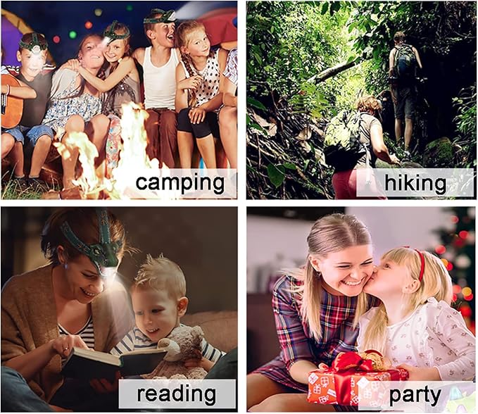 - [Gift for kids] This dinosaur headlamp with a cute and beautiful package is a perfect gift for boys and girls to explore nature, suitable for birthdays, Easter, Halloween, Thanksgiving, and Christmas. It is an ideal gift for camping, hiking, hunting, and other outdoors activities.