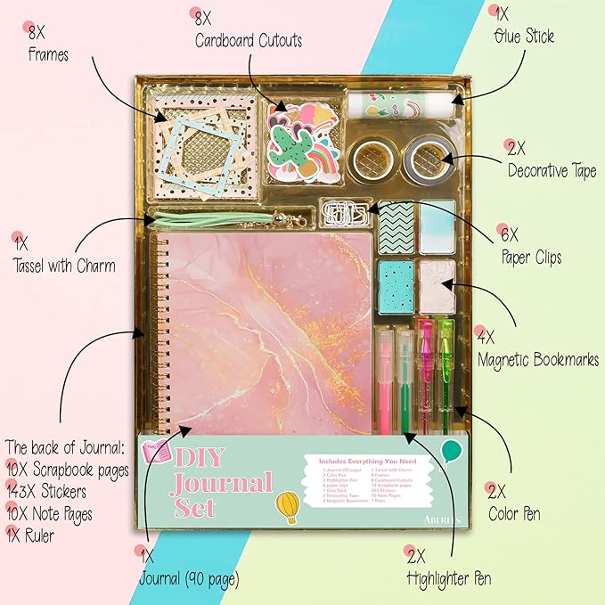 - DIY Journal Set All in One Box: Our 50+ pcs journal kit has everything needed to keep the motivation going. Included 1 beautiful 90 pages journal, 143 stickers, 8 cardboard cutouts, 10 sticky notes, 8 paper frames, 10 scrapbook pages, 4 magnetic bookmarks, 1 glue stick, 1 tassel with charm, 4 pens (2 gel pens & 2 highlighters), 2 glitter tape rolls (silver & gold), 6 paper clips, 1 ruler, they are packed in a hard gift box. Let’s use it to save memories in creativity flow and a fun way!