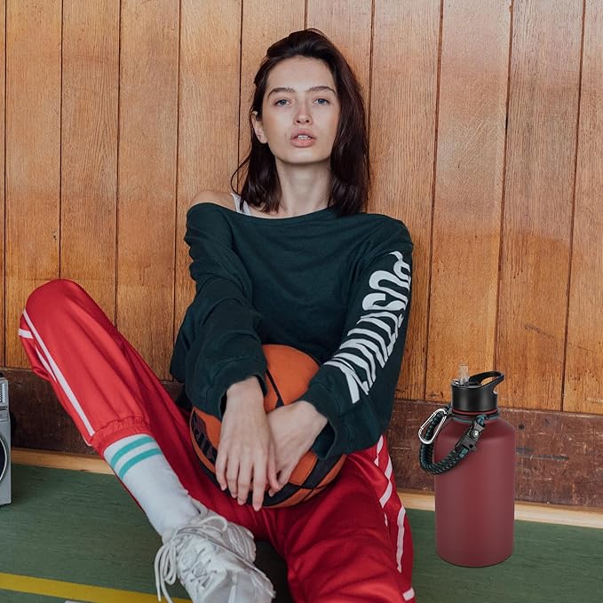 64 oz Insulated Water Bottle with Straw & Spout Lids, Stainless Steel Metal Half Gallon Water Jug with Paracord Handle, Double Wall Vacuum, Leakproof, Keep Drinks Cold & Hot, Brick Red