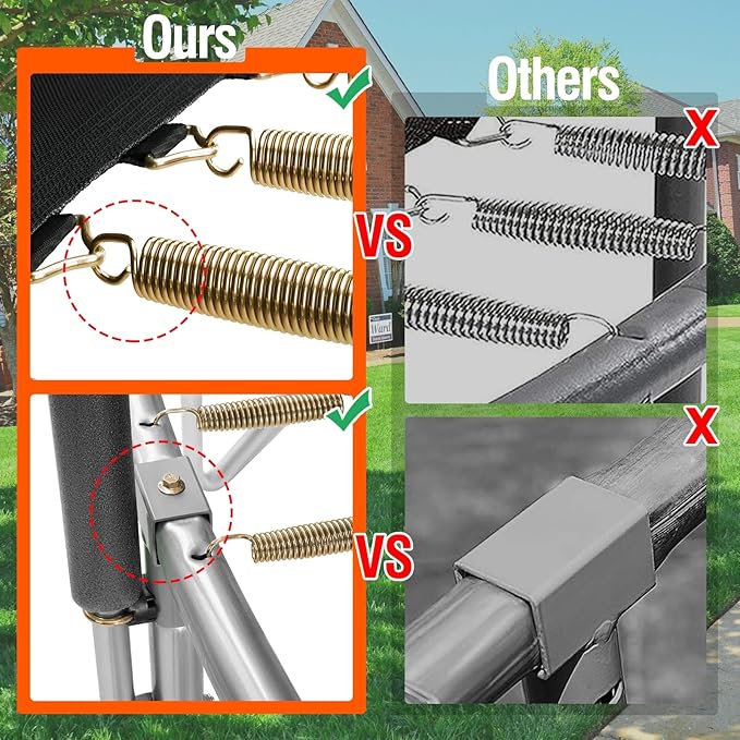 - 🏀【Higher Quality Springs and Jumping Mat】Bounce is fantastic with springs and mat. 15ft trampoline has 108pcs heavy galvanized 145mm springs provide rust resistant and superior bounce. High density jumping mat(pp material) is fade-resistant and wear-resistant which can hold up to 400lbs.
