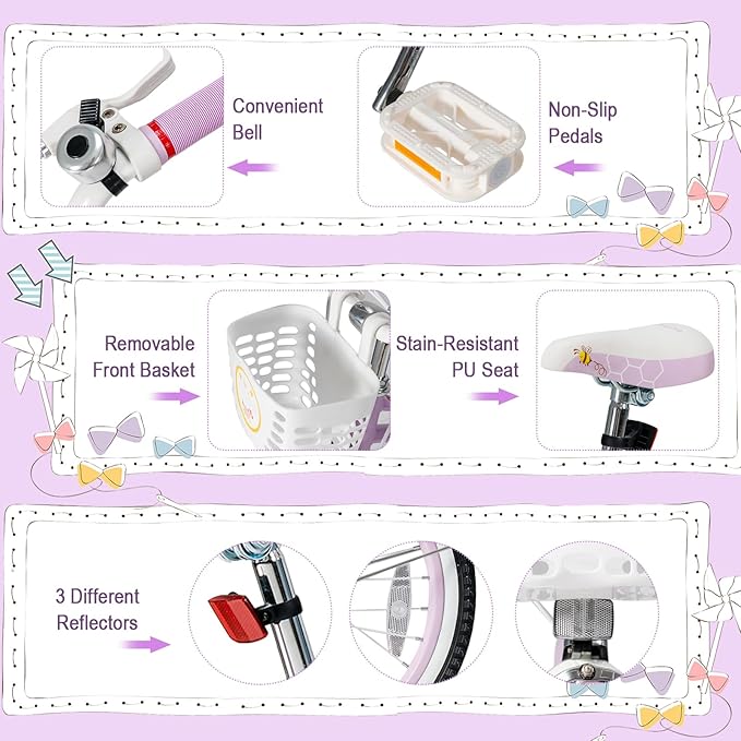- 【Humanized Design】: The kids bicycle comes with a convenient bell for added fun and safety, and there exist 3 different reflectors to enhance visibility during low-light conditions. Besides, the kids bike also comes with a removable front basket, bringing convenience for carrying belongings. And it meets ASTM and CPSIA safety standards for your peace of mind.