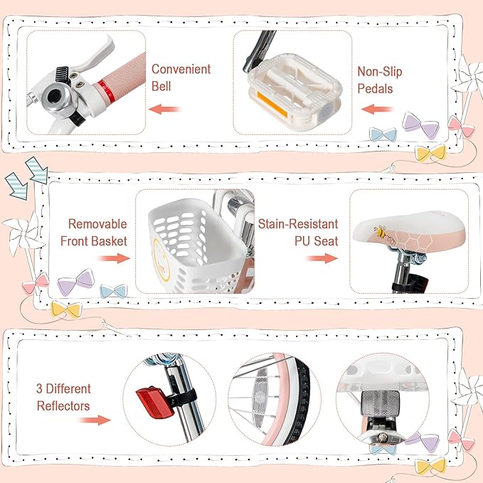 - 【Humanized Design】: The kids bicycle comes with a convenient bell for added fun and safety, and there exist 3 different reflectors to enhance visibility during low-light conditions. Besides, the kids bike also comes with a removable front basket, bringing convenience for carrying belongings. And it meets ASTM and CPSIA safety standards for your peace of mind.