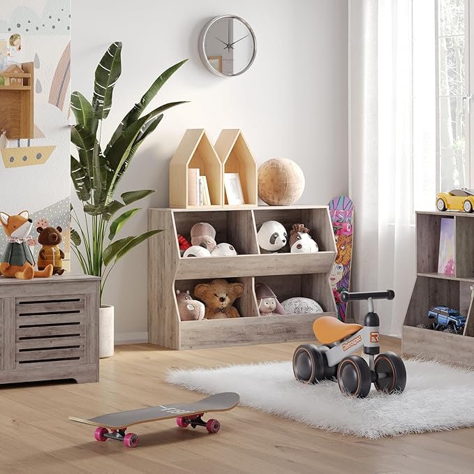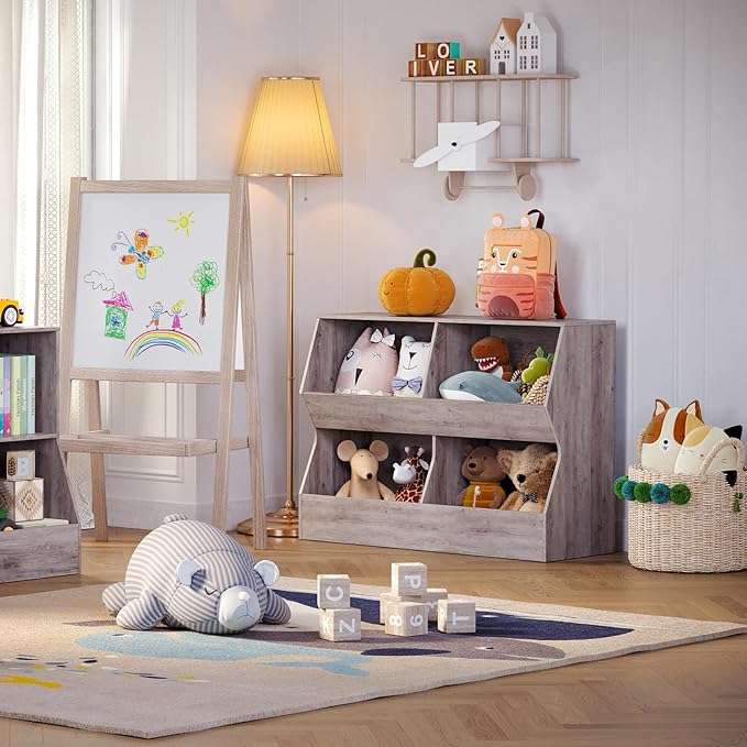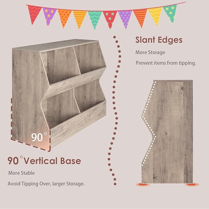 - 【Multifunctional Storage Cabinet】The children's storage unit combines bookshelf and toy storage. 4 open storage bins are spacious for a variety of sizes of dolls, blocks, toy cars, balls,books etc. The slanted baffle on the upper level prevents items from falling and brings more storage. A flat top brings a stage for picture frames