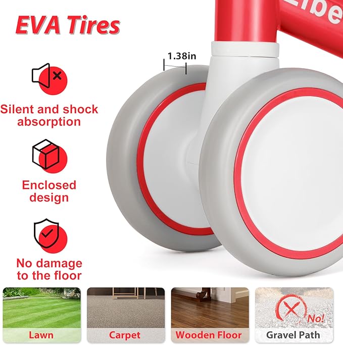 - BABY-FRIENDLY DESIGN: Tailored for baby's comfort and growth in mind. The adjustable PU seat, ranging from 9.7" to 11", grows with baby. The rubber bike handles are tear and chew-resistant, while the EVA tires offer a smooth ride and significantly reduce noise for a peaceful ride