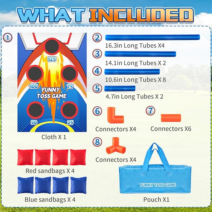 - The bean bag toss game set You will receive 1 Rocket Theme Bracket,Size 35*24Sturdy and easy to setup,Different scoring cornhole increase the fun of outdoor activities.4 red bean bags and 4 blue bean bags,1pcs storage bag--Help your children develop a good habit of packing toys.