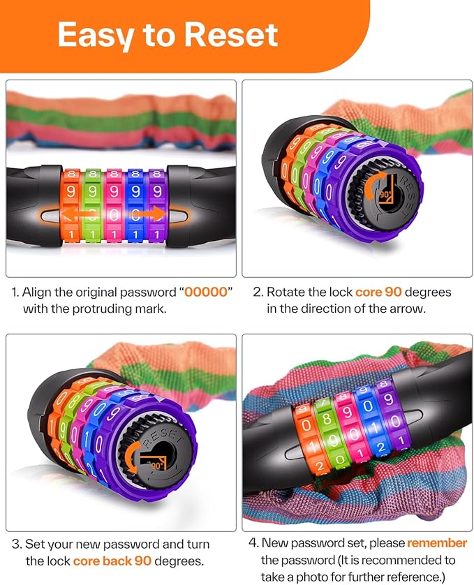 - High Security & Keyless Design: Say goodbye to the hassle of carrying keys and hello to keyless convenience. The advanced 5-digit combination lock offers unparalleled protection, with up to 100,000 possible combinations, making it virtually impossible to crack. This bike chain lock is the perfect choice for those who value safety and convenience above all else.