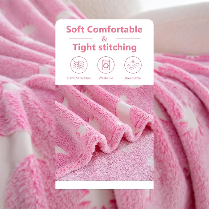 - Interesting & Soothing: Magical glow in the dark blanket, adorned with cute pink moon patterns, can capture the vivid imagination of your kids and paint a wonderland of fairy tales in their sweet dreams. Throw blanket that can glow in the dark is a reliable night guardian who will take good care of your boys/girls who are afraid of "monsters" in the dark while having a sound sleep, which means busy mums and dads can enjoy more time of their own.
