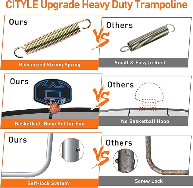 - 【Safety First】10 FT Trampoline is equipt with 6 high safety enclosure poles and heavy gauge galvanized rust resistance steel construction. 3 W-shaped legs secure stability. We have comprehensive testing of the chemical composition of the material and the structure design of the product to ensure its safety.
