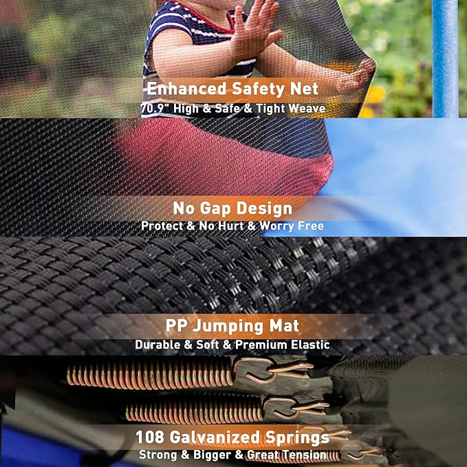 - 【Superior Bounce Experience】54 rust-resistant galvanized trampoline springs securely attach the tightly woven jumping mat and frame together, offering superior and impressive bounce. The jumping mat is made of PP material with premium elasticity-back property allowing kids to jump higher and merrier.