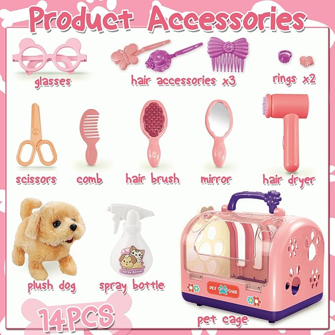 - Grooming for Your Plush Dog: In this pet care playset, there are a variety of simulated grooming tools for kids to play with, allowing them to pretend to beauty hairdressing for the plush dog, including an electric plush dog toy, a pet cage, a spray bottle, a hair dryer, scissors, glasses, a mirror, 2 rings, 2 combs, and 3 hair accessories.