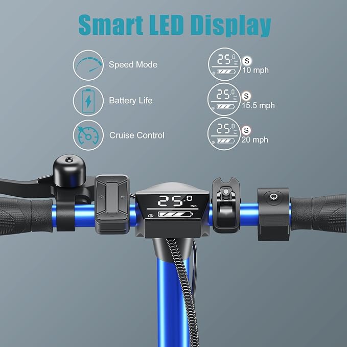 - 【📱Smart Riding Experience】Enhance your ride with the E22 PRO's smart features. Pair the adult electric scooter with the dedicated app on your phone to control cruise control, select speed levels (10MPH / 15.5MPH / 20MPH), manage the light system, and check battery life. This one-stop solution is perfect for your daily commute, offering convenience and advanced functionality.