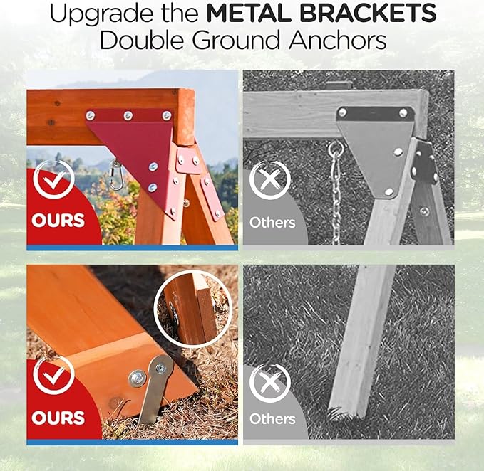 - STABILITY STRUCTURE: The swing set triangular structure and Semi-closed metal brackets connect the beam and posts very strongly, maintain stability when kids enjoy their swings; 2 anchors for each post