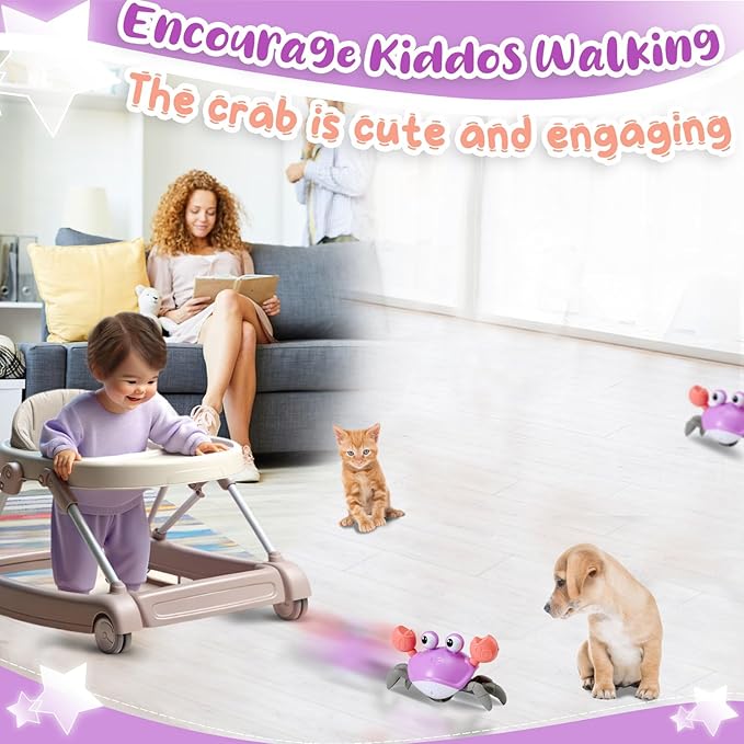 - Crawling Crab Baby Toy: It moving fast, skitters sideways like a real crab, and plays fun sounds and music and lights up. It has sensors that reverse its direction when it nears an obstacle.