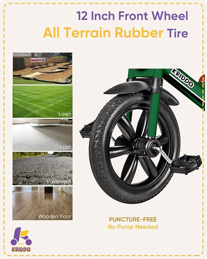 KRIDDO Kids Tricycles Age 2 Years to 5 Years, 12 Inch Puncture Free Rubber Wheel w Front Light, Adjustable Seat Height, Gift Toddler Tricycles for 2-5 Year Olds, Trikes for Toddlers, Green